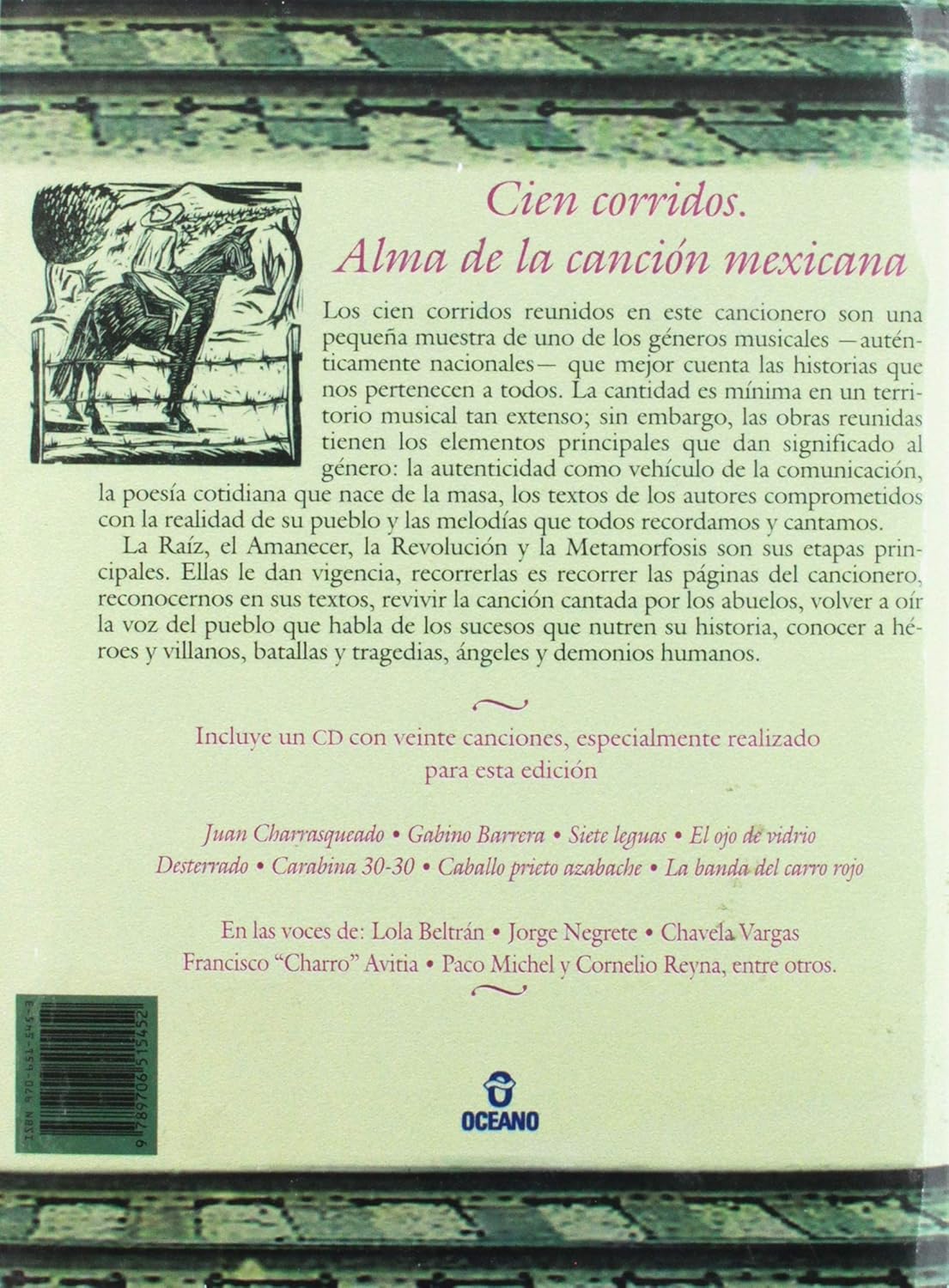 Compilación e historia de los corridos mexicanos. Cancionero con una pequeña muestra de este género musical. La Raíz, el Amanecer, la Revolución y la Metamorfosis son sus etapas principales. Incluye disco con veinte canciones, especialmente realizado para esta edición.